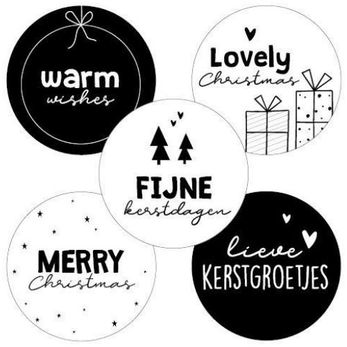 De reeks bestaat uit 5 verschillender soorten kerststickers, zoals te zien is op de afbeelding. Je bestelt deze stickers per set van 10 en ontvangt dan van elke sluitsticker 2 stuks.