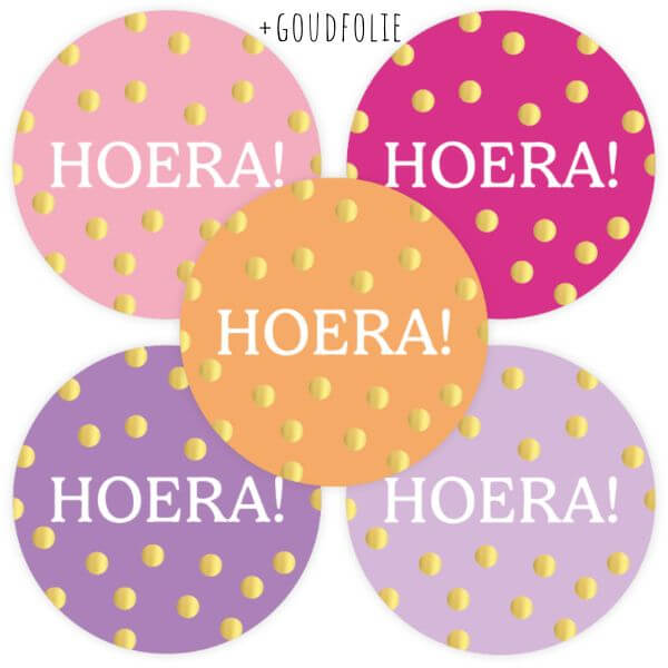 Vrolijke roze, paars en oranje stickers met in goudfolie de tekst: Hoera